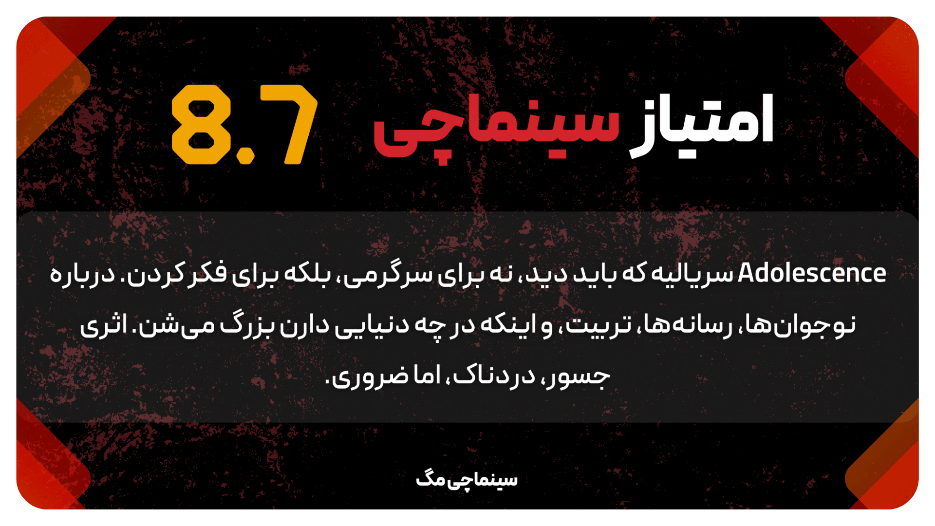 تنها نکتهای که شاید برای برخی بینندگان سخت باشه، فضای سنگین سریاله. اینجا خبری از پیچشهای نمایشی یا سرگرمی صرف نیست. «Adolescence» صادقانه، واقعی و تلخه. و البته گاهی اونقدر به واقعیت نزدیک میشه که تحملش آسون نیست.
